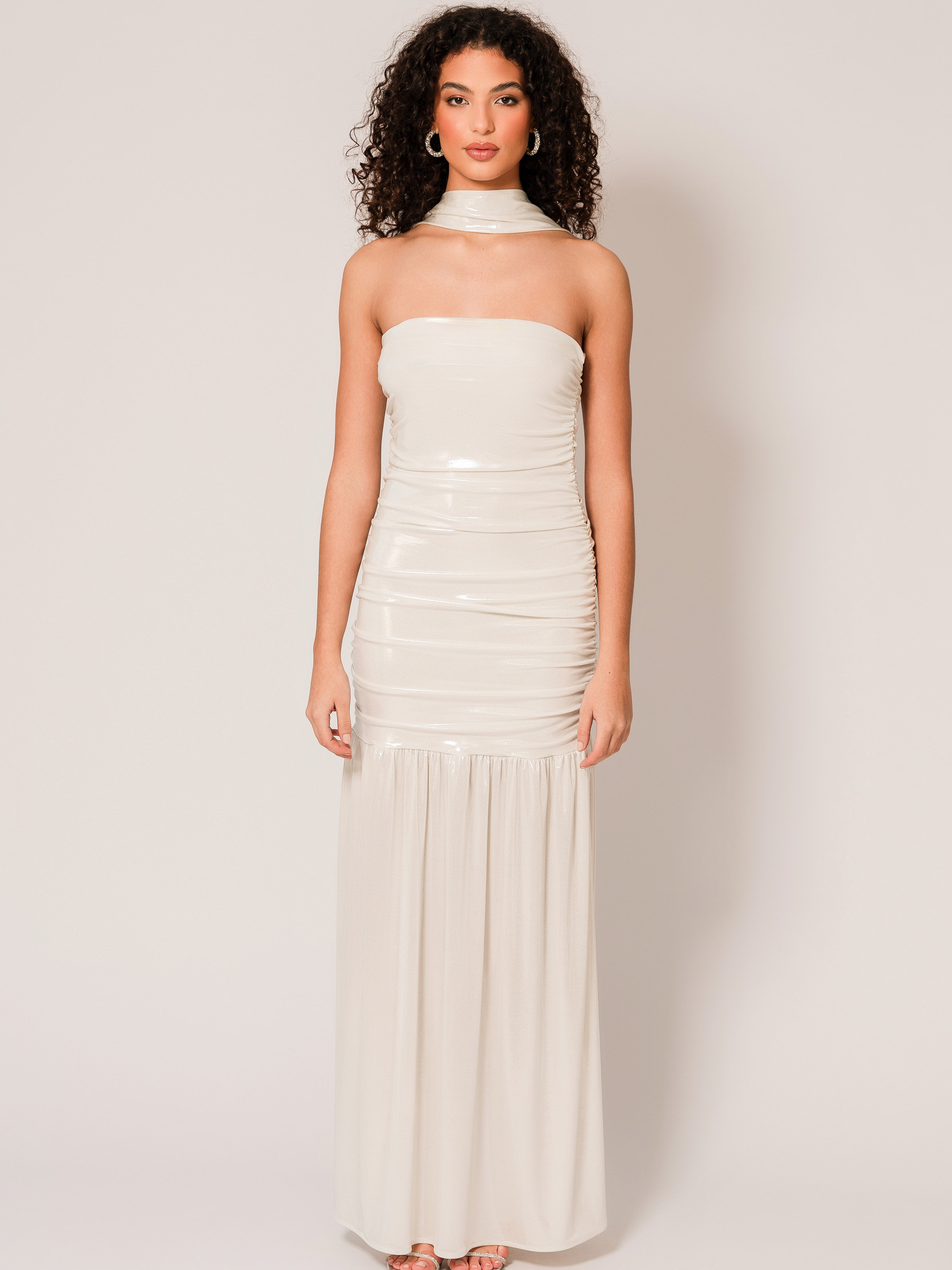 Αποπνέοντας λάμψη και κομψότητα, αυτό το μάξι στράπλες φόρεμα στην απόχρωση του πούρου με χρυσούς ιριδισμούς αγκαλιάζει υπέροχα τη σιλουέτα. Διαθέτει ιδιαίτερη λάμψη στο ύφασμα, διακριτικές σούρες που αναδεικνύουν τη μέση και μια εντυπωσιακή λεπτομέρεια: το δέσιμο στον λαιμό, που προσθέτει μία έξτρα πινελιά αριστοκρατικής γοητείας. Ιδανικό για βραδινές εμφανίσεις που δεν θα περάσουν απαρατήρητες.