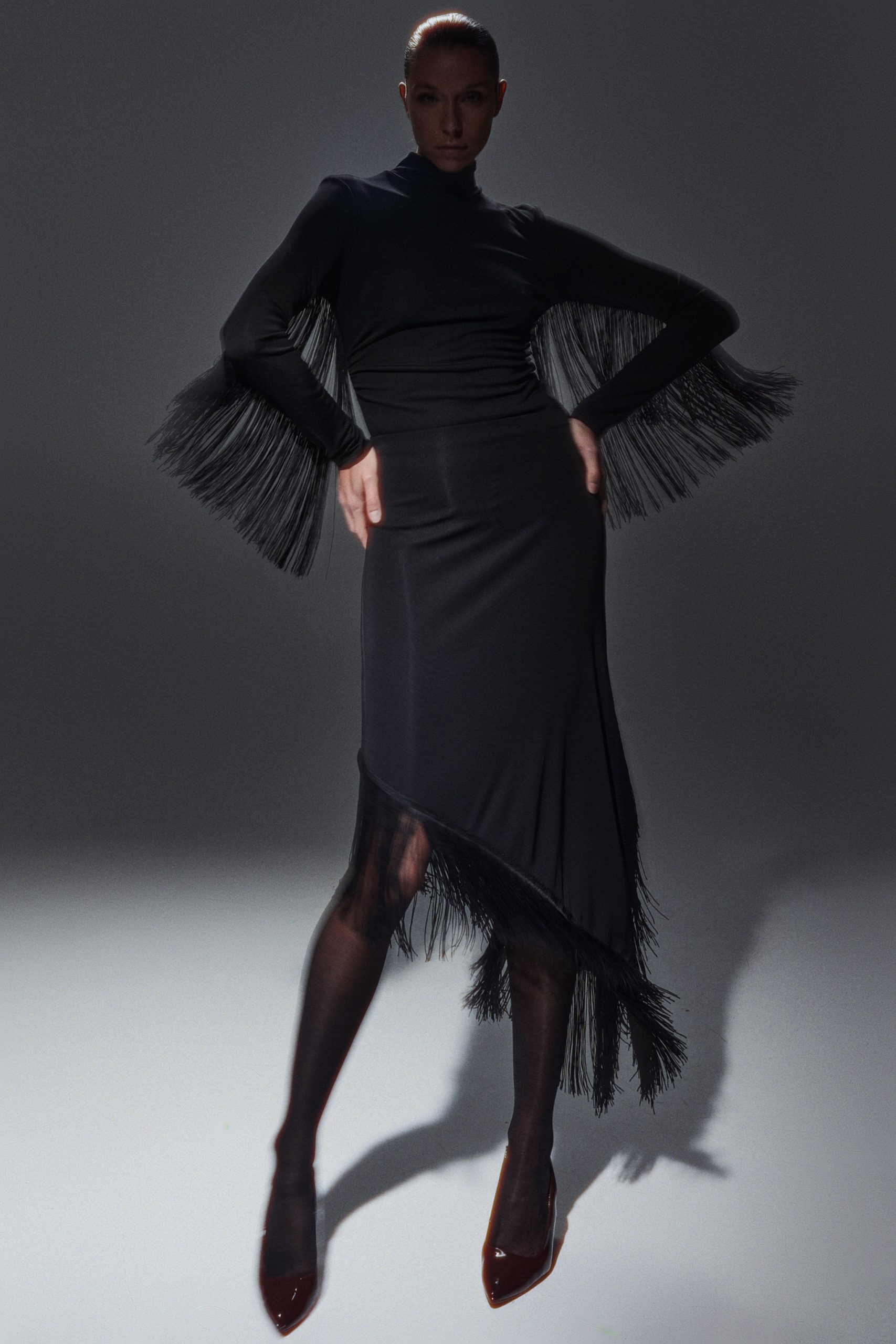 Asymmetrical skirt. Straight line. Side slit. Fringed detail on the hem. Regular fit