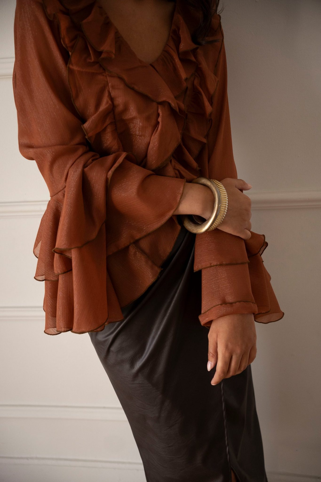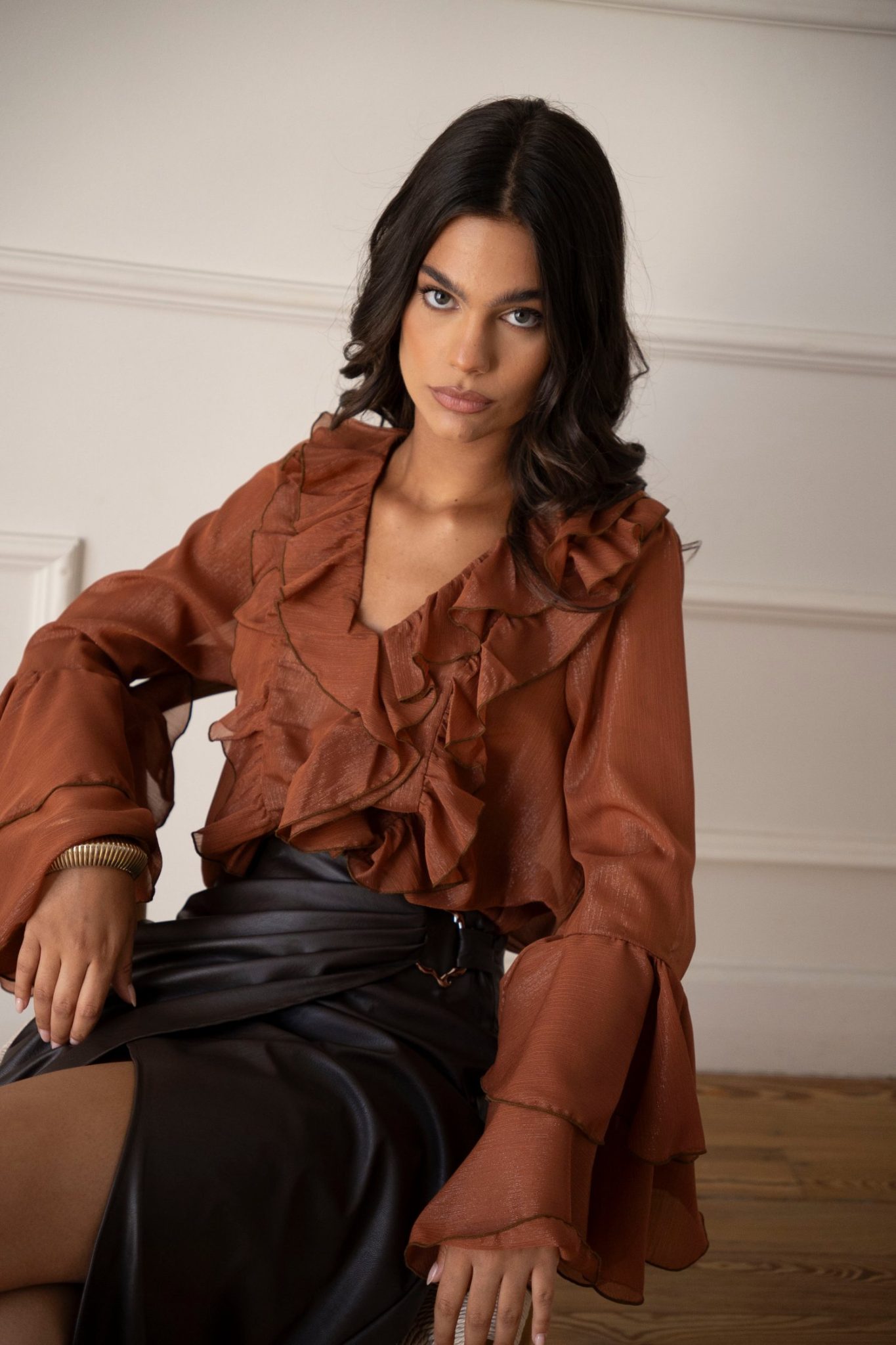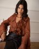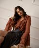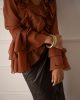 Ιριδίζον πουκάμισο με εντυπωσιακά βολάν στο σώμα και στα μανίκια που προσδίδουν υπέροχη κίνηση και αέρα.