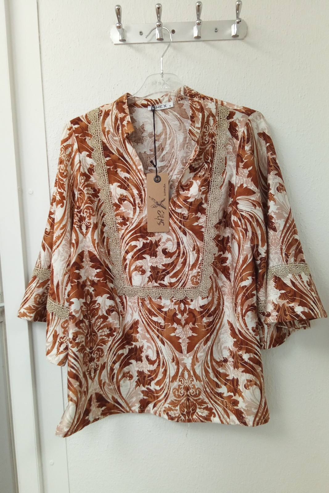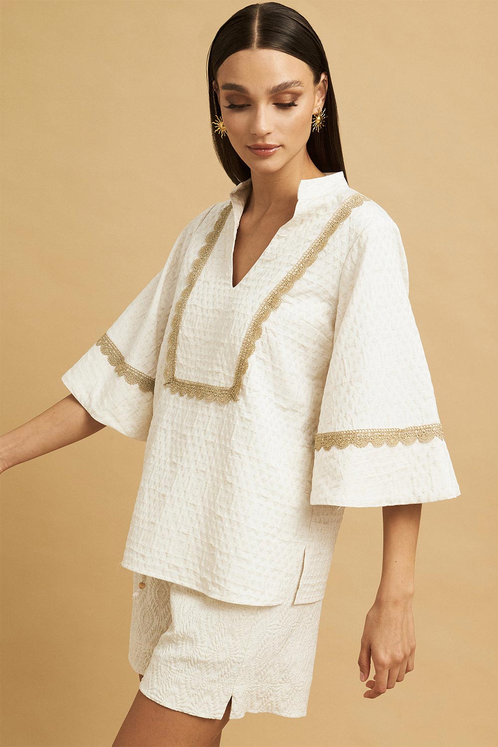 Μπλούζα με ανάγλυφο σχέδιο σε εκρού απόχρωση και χρυσές λεπτομέρειες.