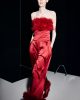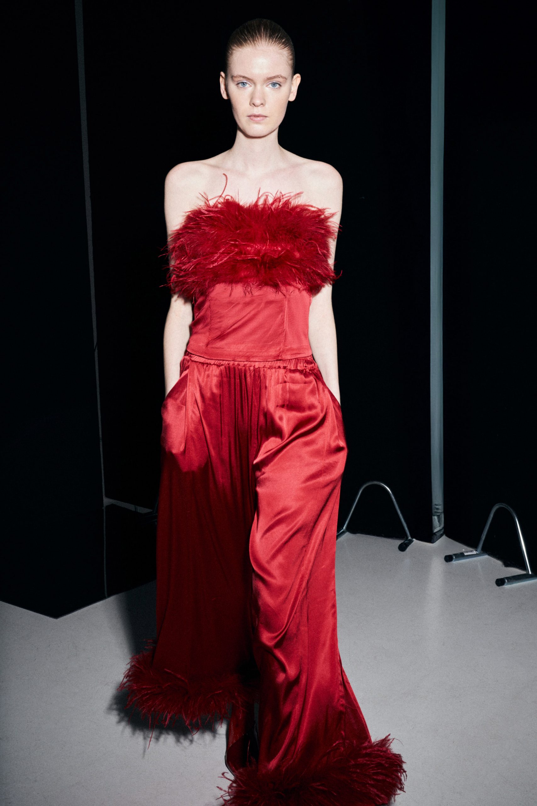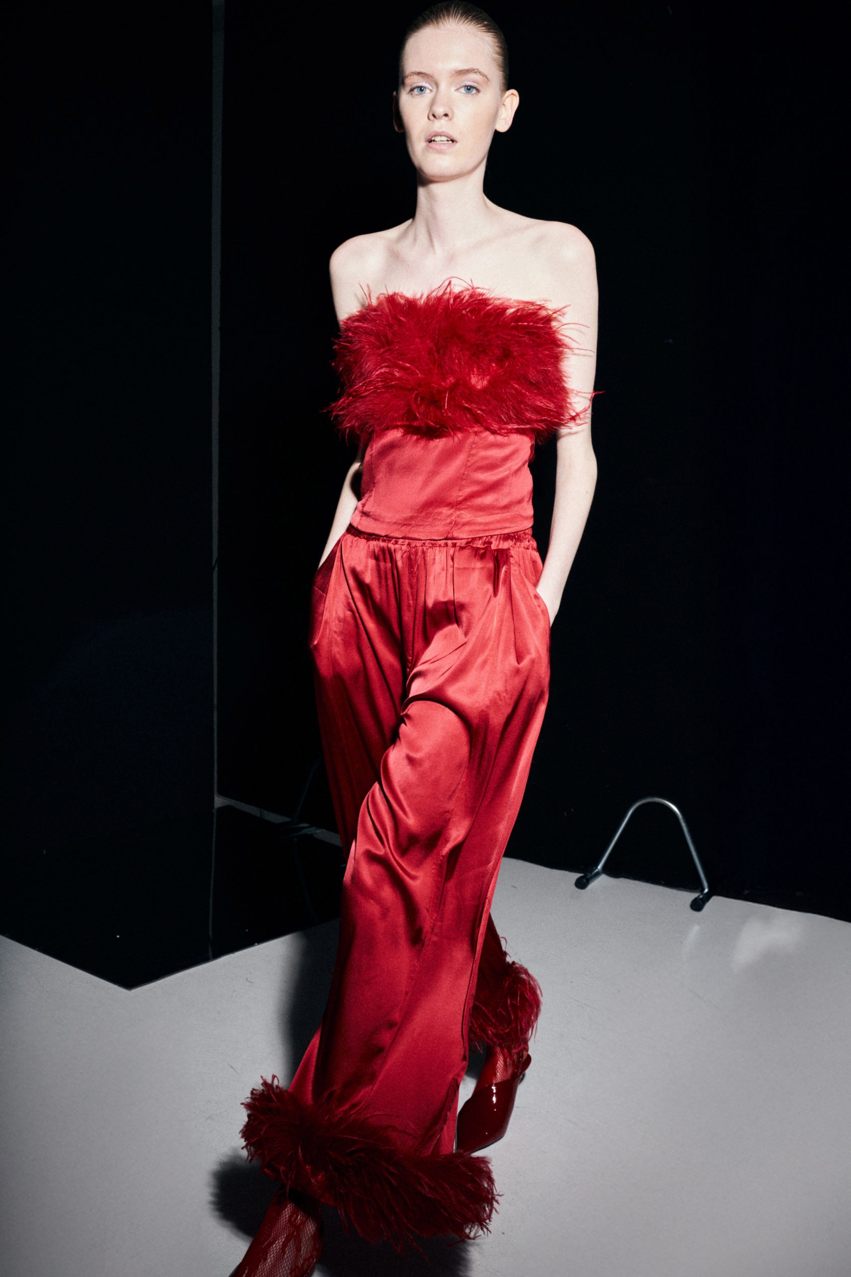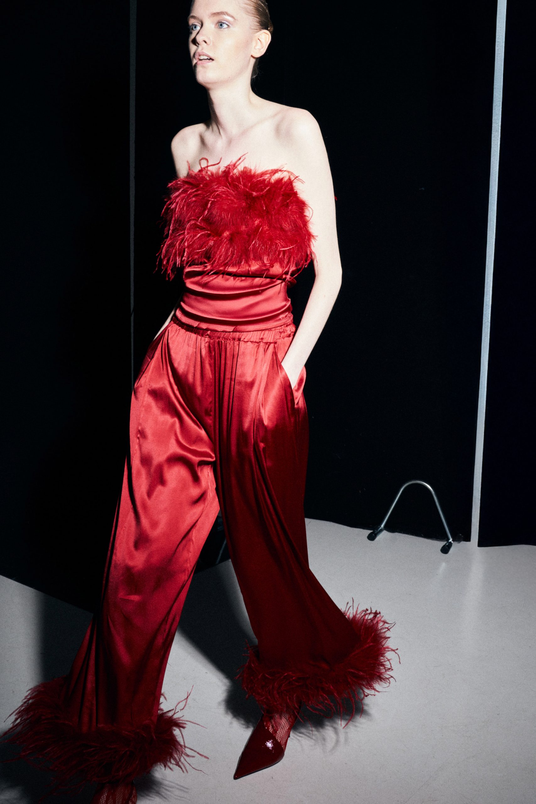 Satin trousers in viscose blend. Wide leg and elastic waist. Side pockets and feathers on the hem. Regular fit